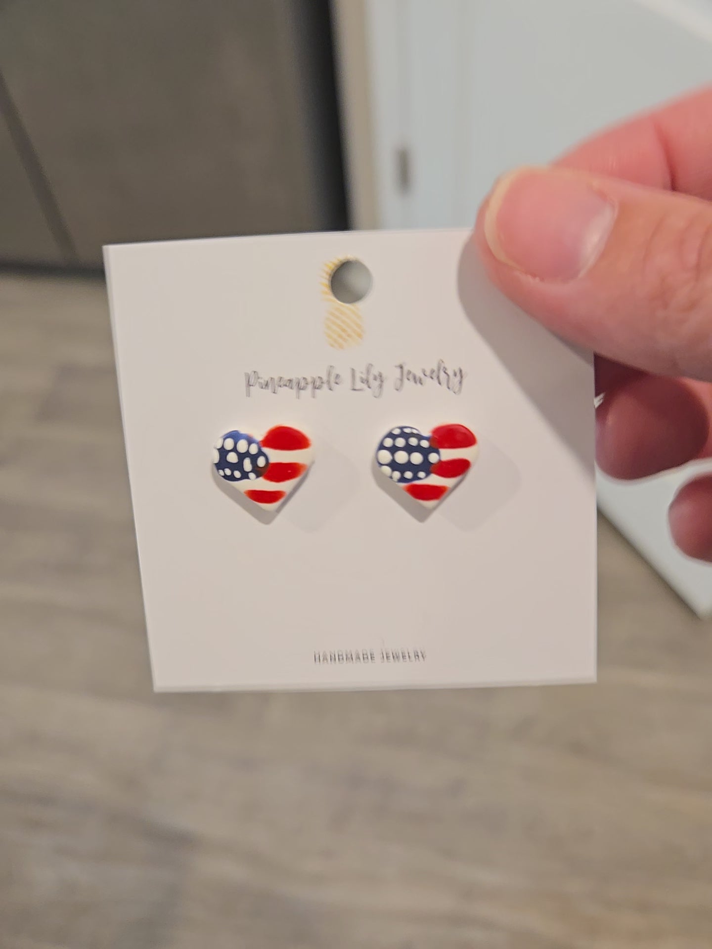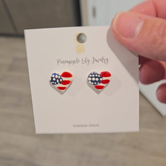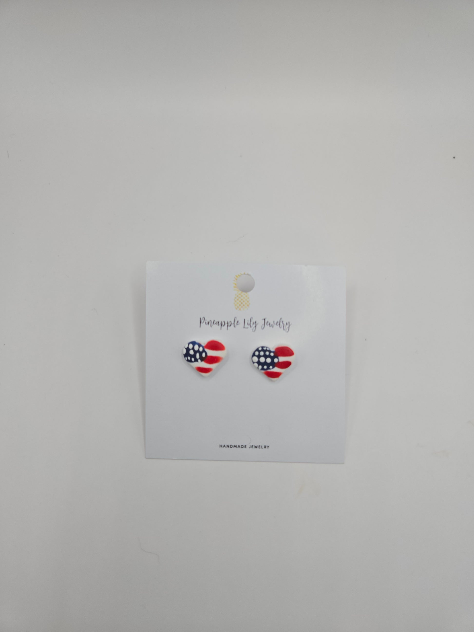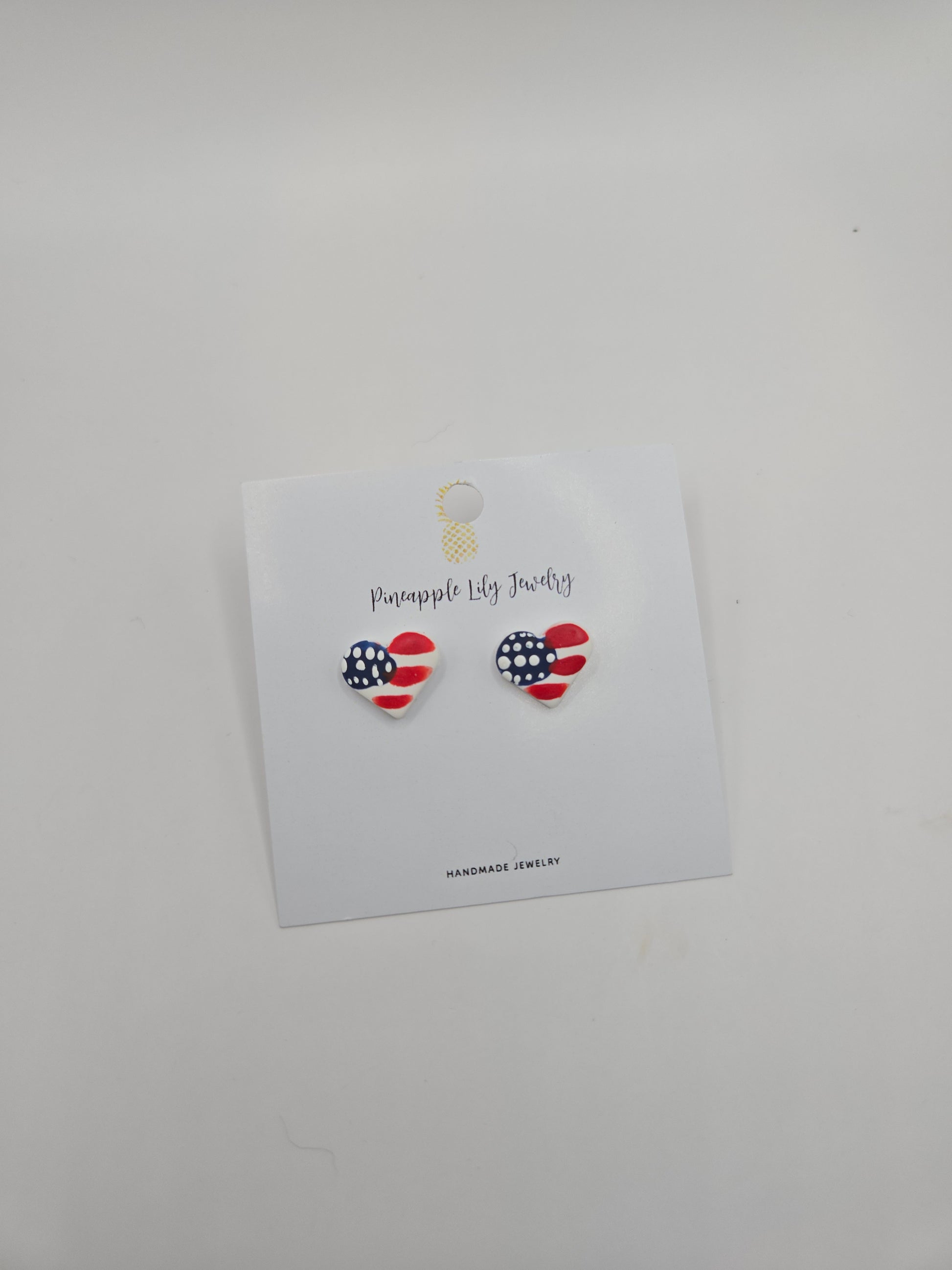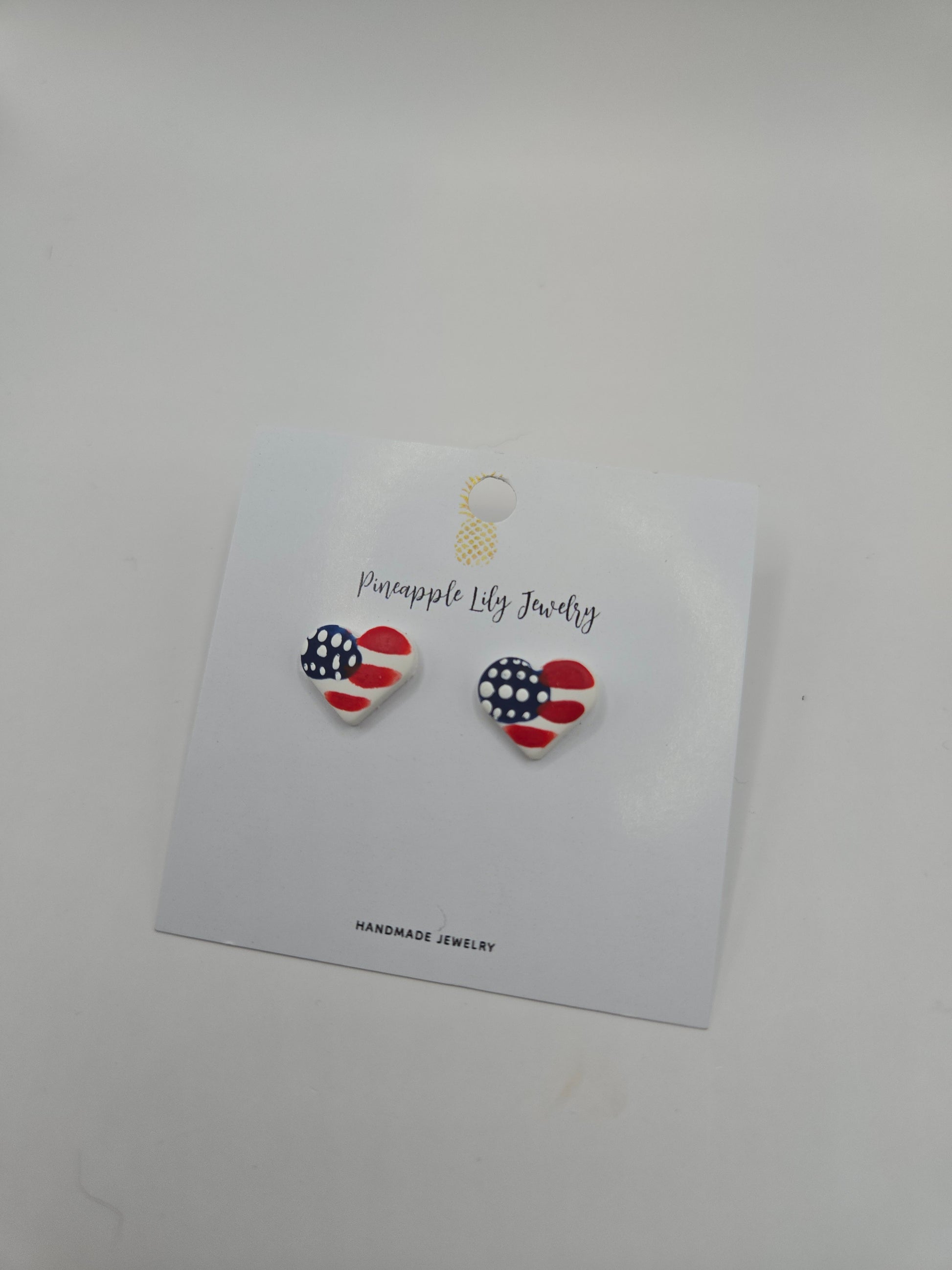 The cutest 4th of july polymer clay studs handpainted in the iconic USA flag pattern. Available in hearts or stars. Features hypoallergenic stainless steel parts.