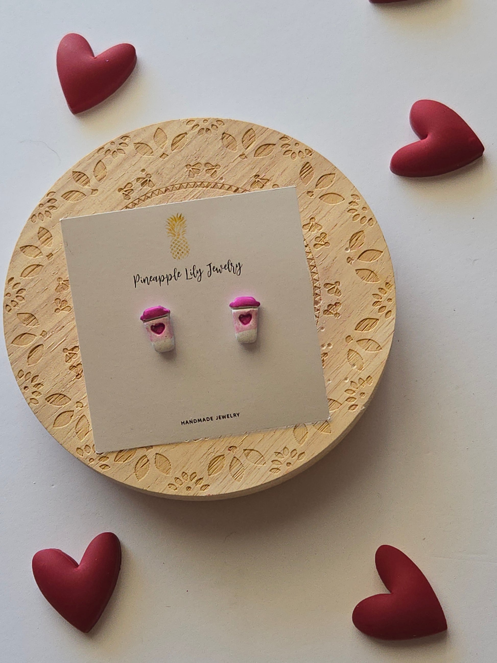 I love you a latte studs. Cutest coffee cup studs with light pink sleeve decorated with pink hearts. Handmade from polymer clay and features all hypoallergenic stainless steel posts. A coating of resign on the back of post for a smooth finish.