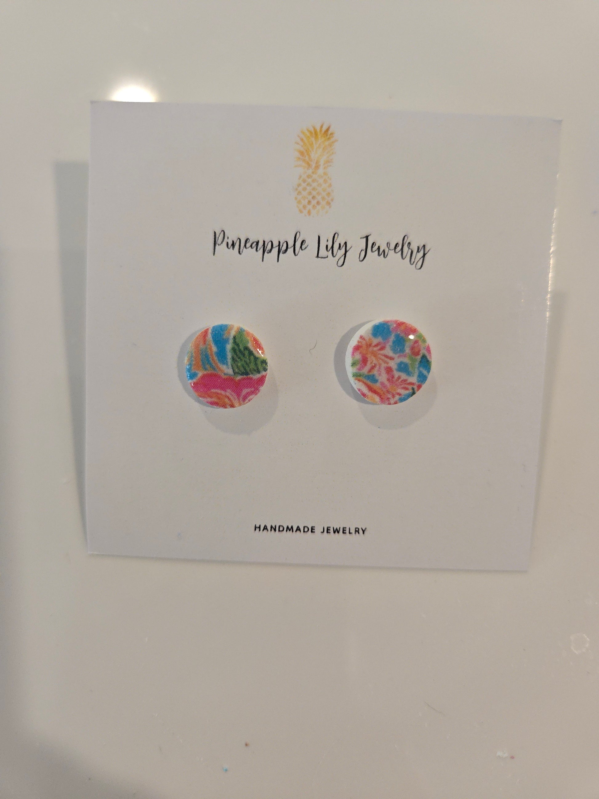 Beautiful lightweight polymer clay mini studs with a Lilly Pulitzer inspired pattern. These are handmade and features only hypoallergenic 18k gold plated or stainless . They have a shiny resin that enhances the vibrant pattern.