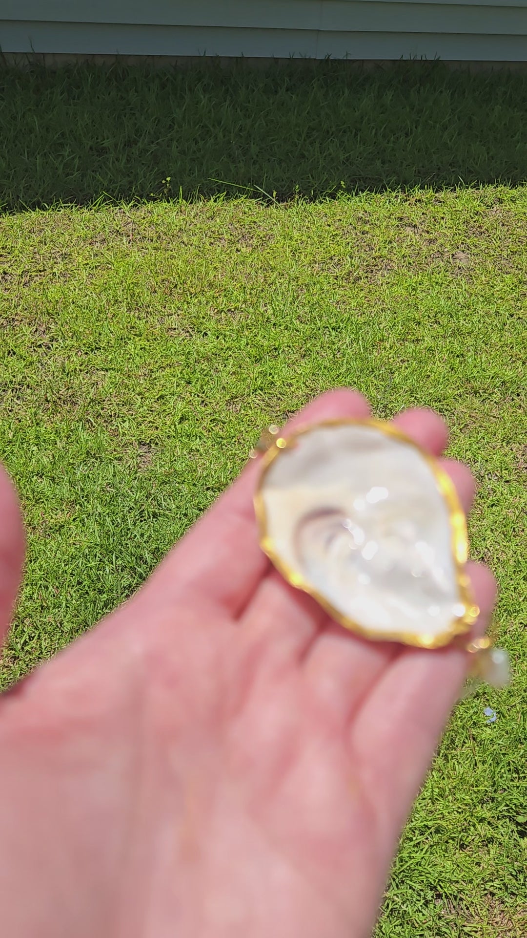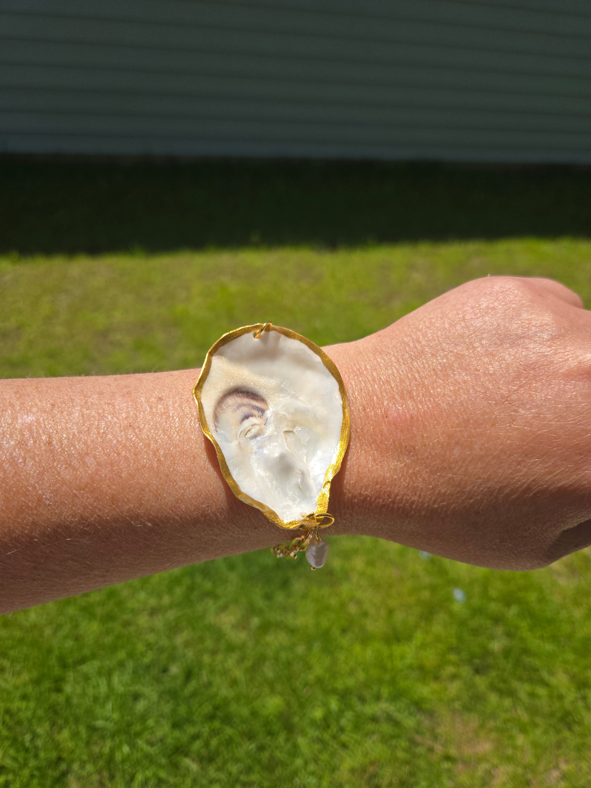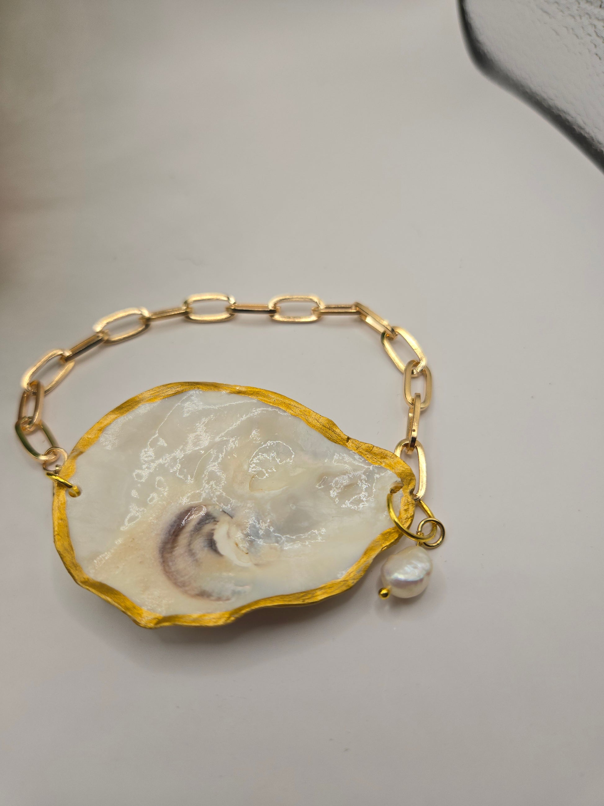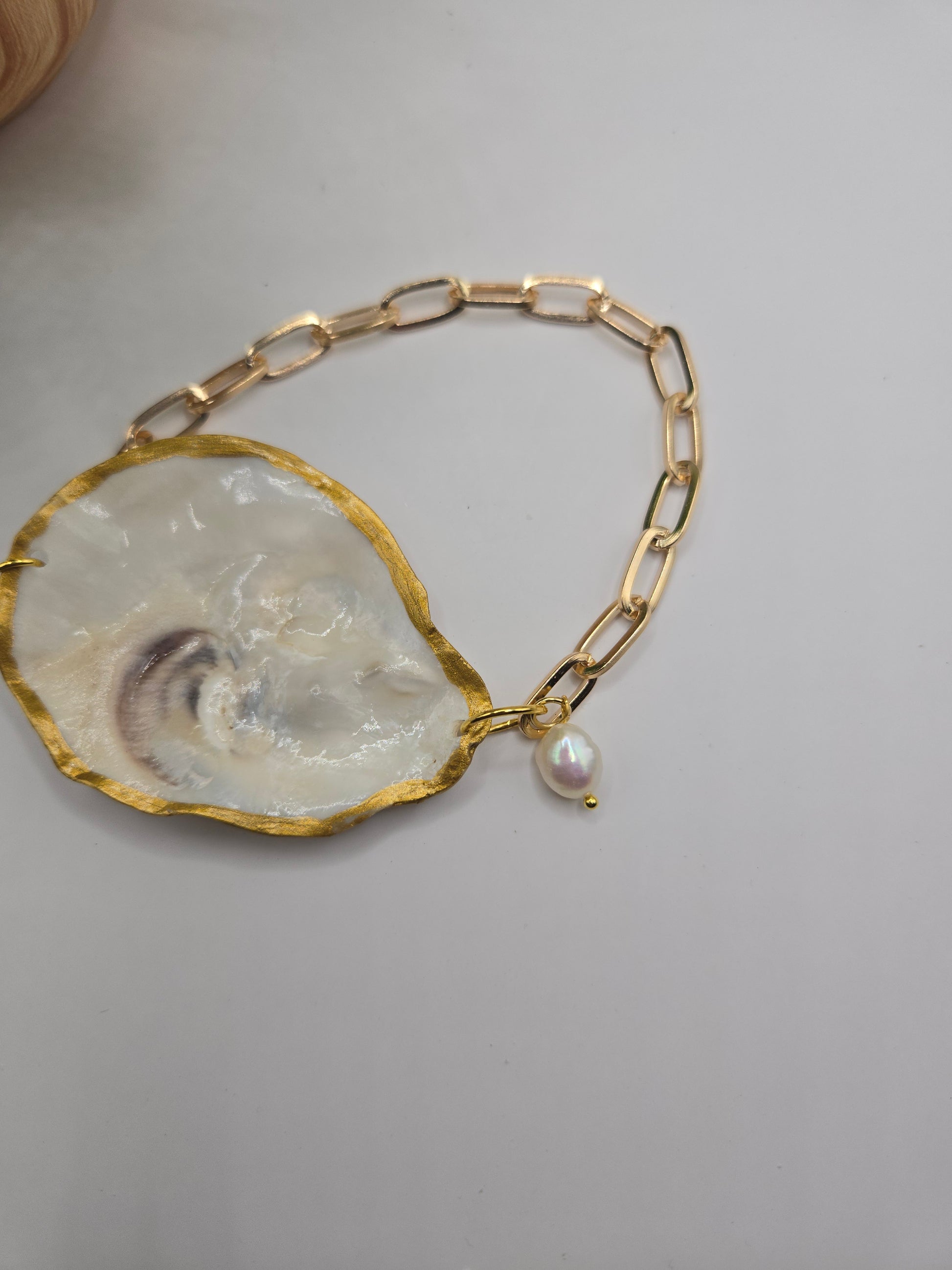 Stunning oyster shell, cleaned , sanded and sealed to let its natural beauty shine thru. This oyster has a gold handpainted trim accompanied by a 18 k gold plated and hypoallergenic bracelet and accented with a pearl bead. We also have a few other charms that could be added. Such as a cross, or an initial or 2025 charm for graduation for an additional $3 a charm.