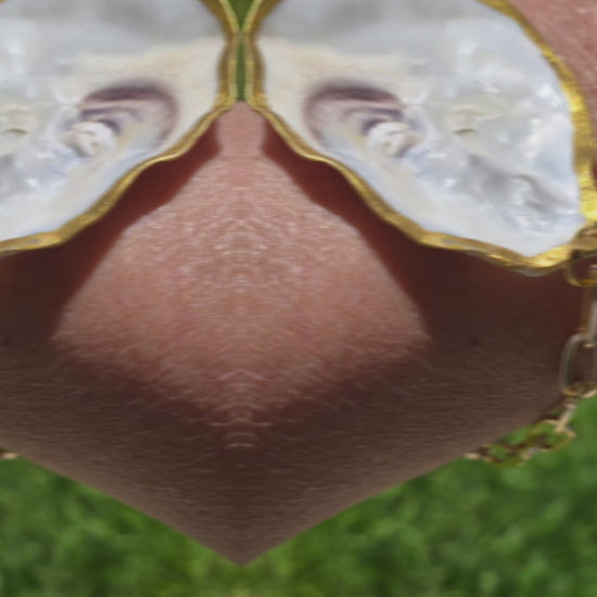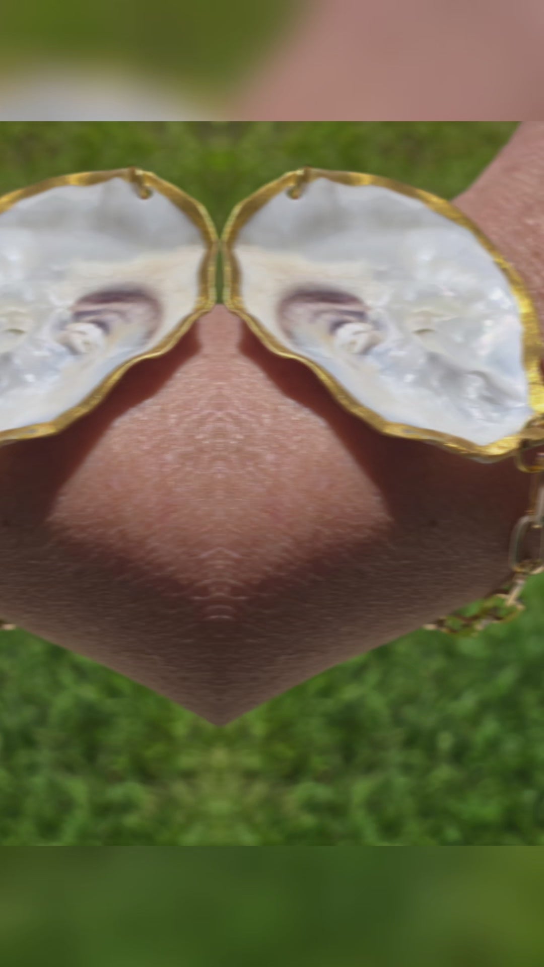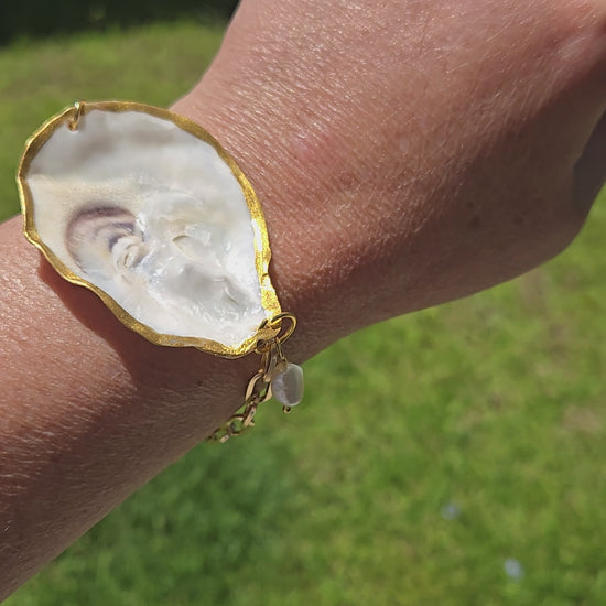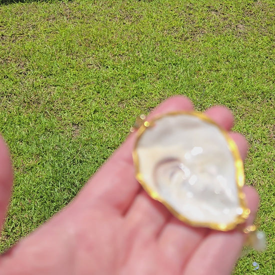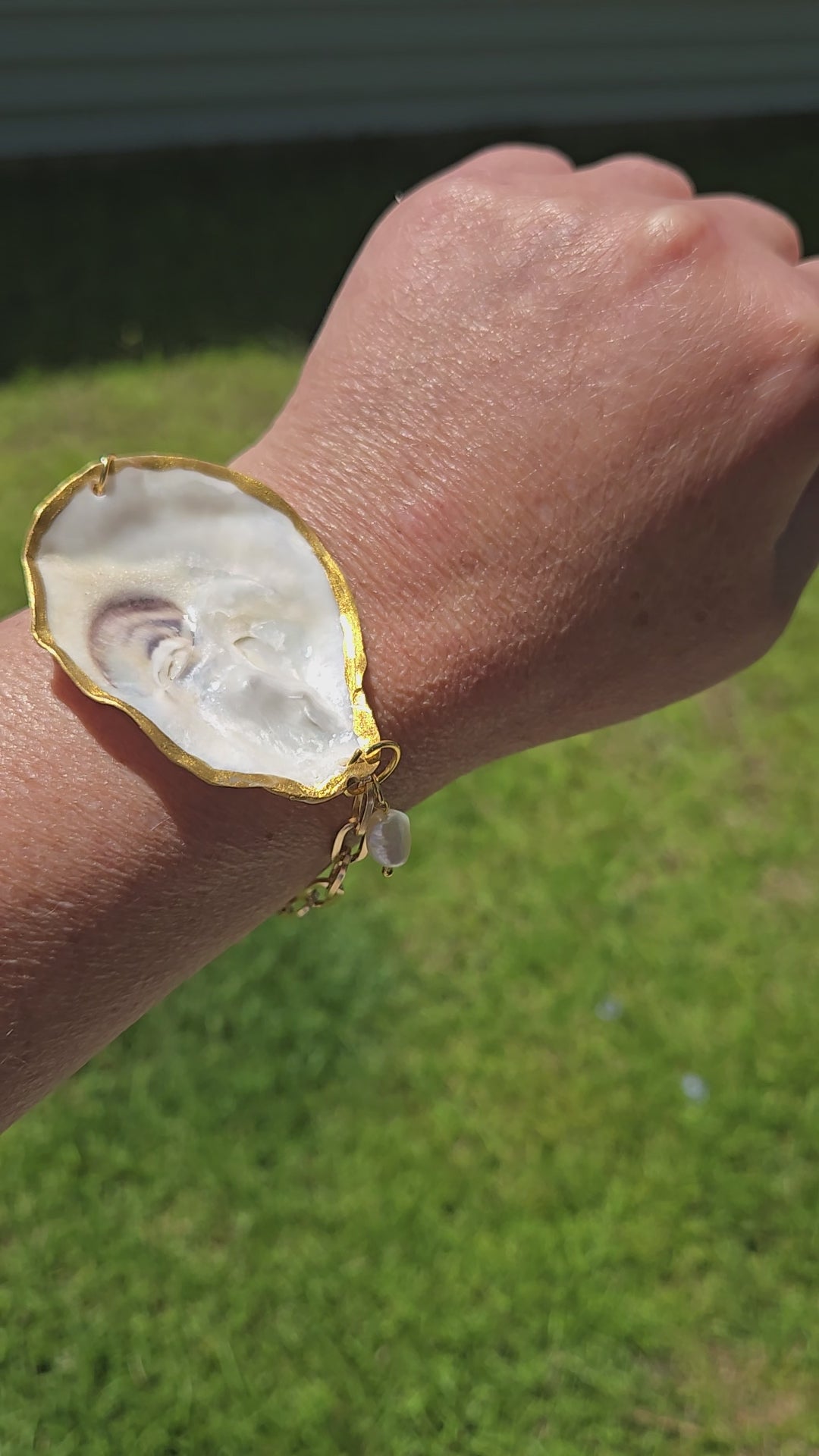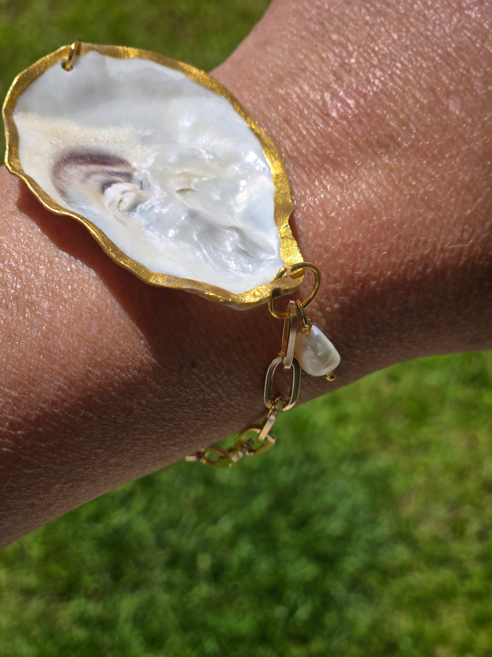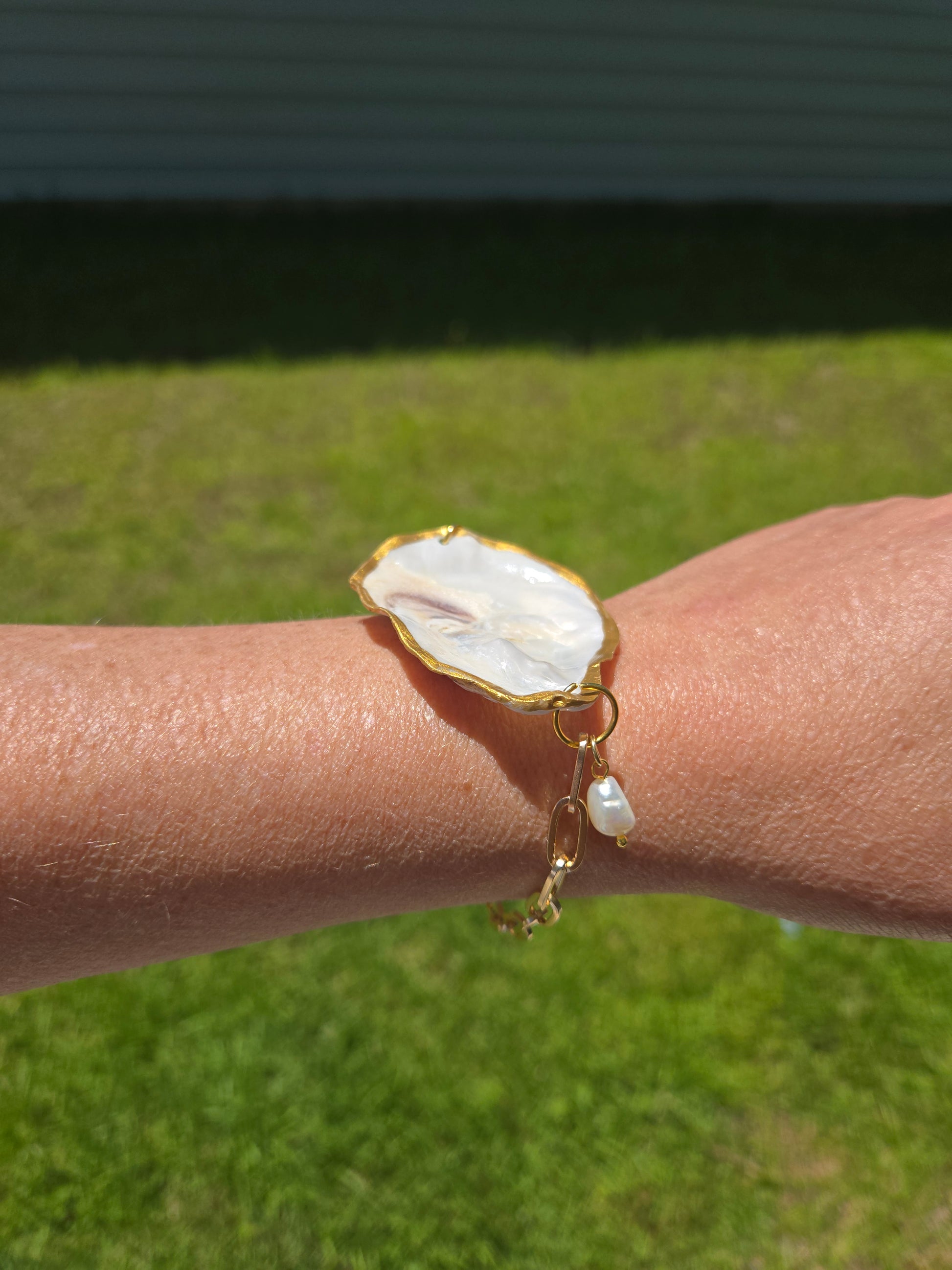 Stunning oyster shell, cleaned , sanded and sealed to let its natural beauty shine thru. This oyster has a gold handpainted trim accompanied by a 18 k gold plated and hypoallergenic bracelet and accented with a pearl bead. We also have a few other charms that could be added. Such as a cross, or an initial or 2025 charm for graduation for an additional $3 a charm.